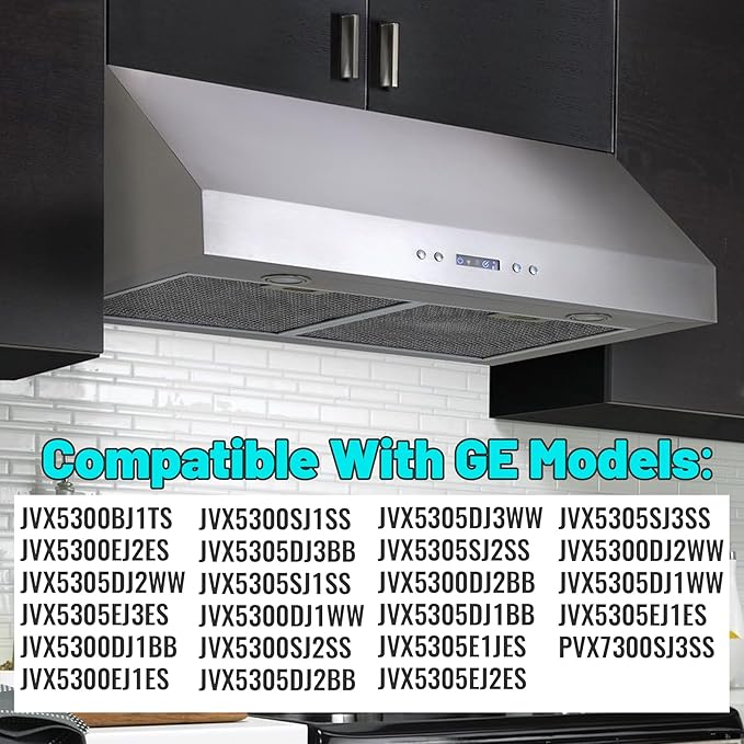 - Perfect Fit for GE Range Hoods: This Range Vent Hood Grease Filter Replacement engineered for compatibility with GE models like JVX5300BJ1TS,JVX5300EJ2ES,JVX5305DJ2WW,JVX5305EJ3ES, JVX5300DJ1BB,JVX5300SJ1SS,JVX5305DJ3BB, JVX5305SJ1SS, JVX5300DJ1WW,JVX5300SJ2SS,JVX5305DJ3WW,JVX5305SJ2SS, JVX5300DJ2BB,JVX5305DJ1BB, JVX5305E1JES,JVX5305SJ3SS, JVX5300DJ2WW, JVX5305DJ1WW, JVX5305EJ1ES, PVX7300SJ3SS, JVX5300EJ1ES, JVX5305DJ2BB, JVX5305EJ2ES, ensures a snug fit with precise dimensions (13.75"L x 13.75"W x 0.35"Th). No modifications needed—just install and enjoy improved ventilation right away.