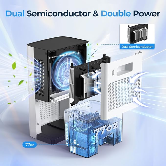 - Upgraded High Efficienly Dehumidifier: Our dehumidifiers utilize semiconductor condensation technology, equipped with dual fans and dual semiconductor condensers, effectively removing moisture from the air to ensure comfortable living. With a large 77oz capacity water tank, in a closed room at 86°F, 80% RH environment, the dehumidifier can collect up to 35oz moisture per day.