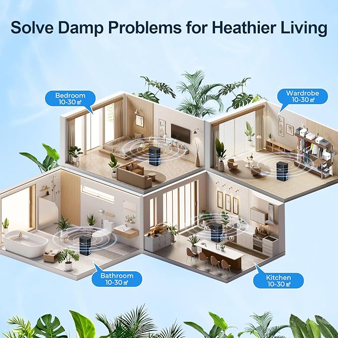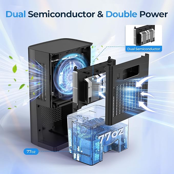 - Upgraded High Efficienly Dehumidifier: Our dehumidifiers utilize semiconductor condensation technology, equipped with dual fans and dual semiconductor condensers, effectively removing moisture from the air to ensure comfortable living. With a large 77oz capacity water tank, in a closed room at 86°F, 80% RH environment, the dehumidifier can collect up to 35oz moisture per day.