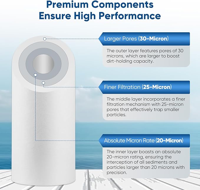 - ❄️【Multi-Layer Density Tech】- This whole house water filter is designed with a density of three PP layers to remove most particles and sediments. The multi-layer density tech can capture impurities targeted and have 30% longer service life than the other common type.