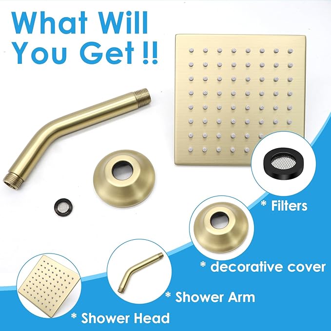 6 Inch Square Shower Head Stainless Steel High Pressure Rain Shower Heads with Extension Arm Adjustable Angle Replacement Luxury Shower Head for Modern Bathroom (Square, Brushed Gold)