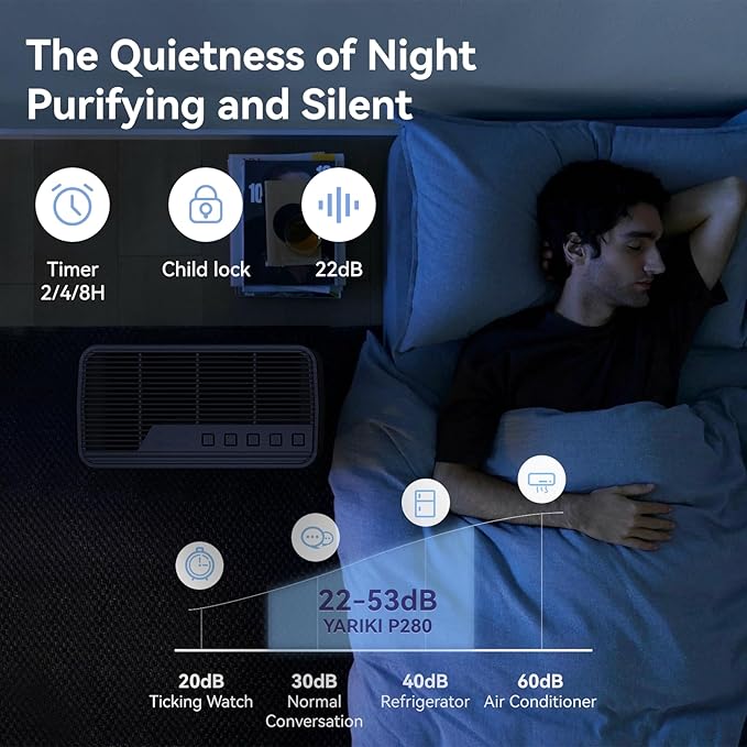 - Quiet, Energy-Saving and Safe: This Bedroom air purifier uses a new brushless motor, and the 22dB noise level is almost silent, which will not disturb your work, study or sleep. Low power operation makes it extremely energy-saving, and the child lock prevents incorrect operation caused by pets or children. Depending on the environment and frequency of use, the HEPA filter should be replaced every 3-6 months (Search ASIN: B0F1MJ5QP6,B0F1MK1KLB).
