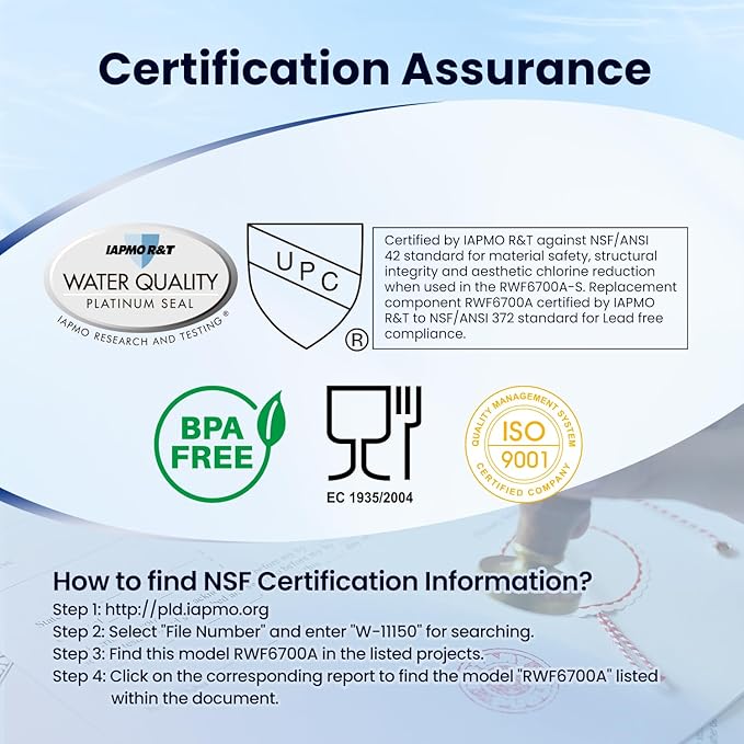 - NSF/ANSI 42 & 372 Certified: Our water filter is crafted with lead-free materials and is certified by NSF/ANSI 42 & 372 standards. It effectively reduces 99% of chlorine, unpleasant taste, odors, heavy metals, and other impurities. With a 0.5-micron filtration precision, it ensures cleaner, fresher, and better-tasting drinking water for your family.