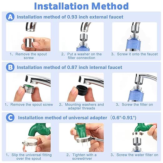 - 【360° Rotating Design】The kitchen faucet water filter features a 360° rotating function for comprehensive filtration. Made from high-quality ABS material, our water faucet filter is durable and resistant to high heat. It also increases water pressure, flushing powerfully and preventing splashing.