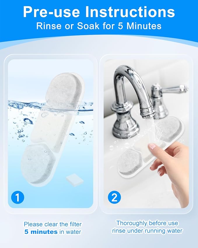 - Replacement: Before use, please soak the dog water dispenser filter for 5 minutes and rinse it for 30 seconds. We suggest replacing the filter every two weeks. If you have multiple pets, please clean the water dispenser more frequently and replace the filter