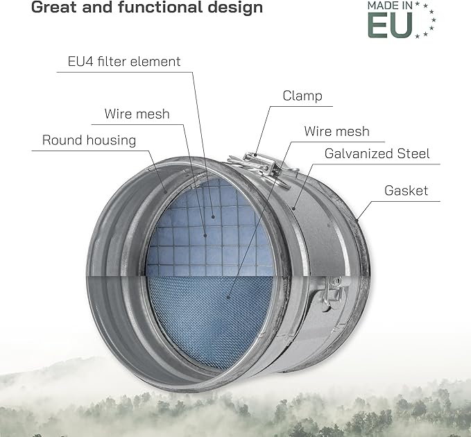 - Filter Element: One G4 class, EU4 filter element included. Protected by wire mesh / dust screen on both sides, made of galvanized steel. The replacement filters are sold seperately as well.