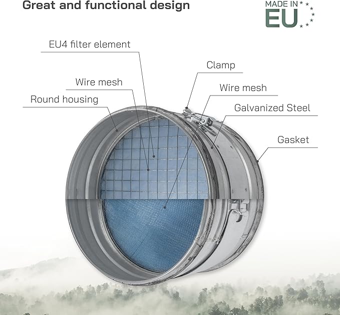 - Filter Element: One G4 class, EU4 filter element included. Protected by wire mesh / dust screen on both sides, made of galvanized steel. The replacement filters are sold seperately as well.