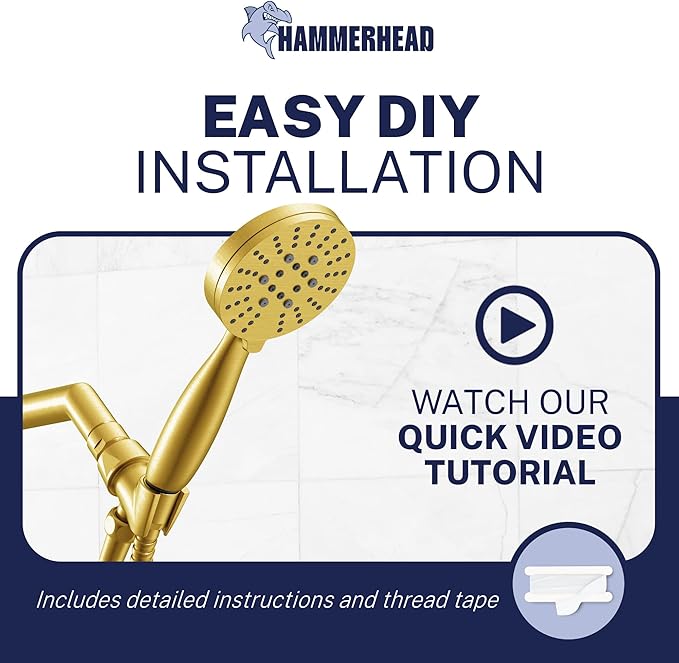 HammerHead Showers® Solid Metal 3-Spray Handheld Shower Head with Long Hose and Holder - BRUSHED GOLD - WIDE, MASSAGE, and MIST Sprays - 1.8 GPM Low Flow Handheld Showerhead - Water Saving Shower Head