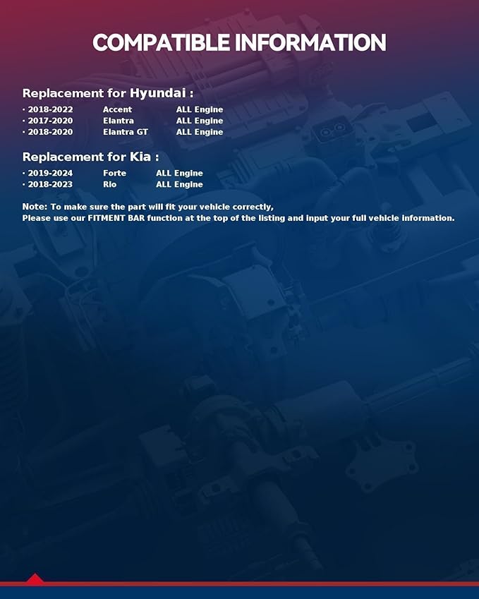 - Compatible Devices : Hyundai Accent (2018-2022), Hyundai Elantra (2017-2020), Hyundai Elantra GT (2018-2020), Kia Forte (2019-2024), Forte 5 (2020-2024), Kia Rio (2018-2023) Hyundai Accent (2018-2022), Hyundai Elantra (2017-2020), Hyundai Elantra GT (2018-2020), Kia Forte (2019-2024), Forte 5 (2020-2024), Kia Rio (2018-2023)