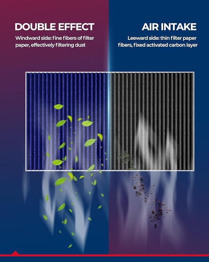 - Strong Adsorption Activated Carbon Layer: Unlike basic filters, our high-end version features an extra-thick activated charcoal layer. This powerhouse effectively absorbs and neutralizes tough odors (like exhaust fumes, smoke, or lingering food smells) and harmful gases commonly found on roads, leaving your cabin air fresh and pure