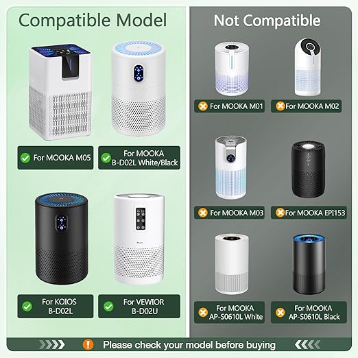 - 【Compatible Models】Our M05/ B-D02L replacement filter is only compatible with MOOKA M05/ MOOKA B-D02L/ KOIOS B-D02L/ VEWIOR B-D02U Air Purifi-ers. Not compatible with MOOKA's Other Air Purifi-ers. Please check your model before buying!