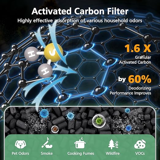 - 【Activated Carbon Filter】Upgraded granular activated carbon physically attaches unwanted odors and fumes, such as smoke, cooking odors, pet odors, VOCS, etc. Great for families with children and pets.