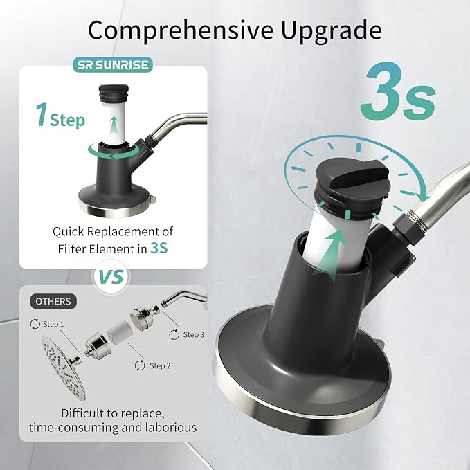 - 【20-Stage Shower Filter Head for Hard Water 】Hard water causing dry skin and dull hair? Our SR SUN RISE Shower Head features a 20-stage filtration system with KDF-55, Vitamin C, Calcium Sulfite, and 7 other premium filter media to effectively remove chlorine, heavy metals, fluoride, and impurities.Perfect for hard water areas, it delivers clean, safe water that’s gentle on your skin, hair, and nails—ideal for families and kids who deserve the best.
