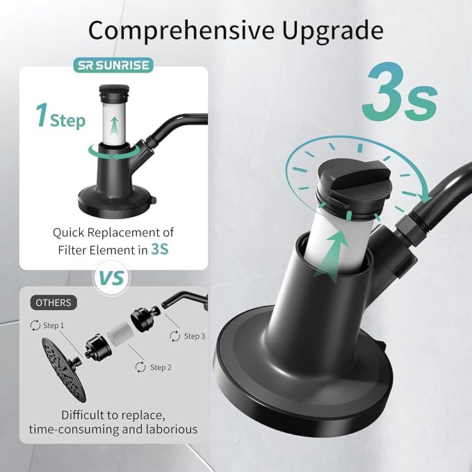 - 【20-Stage Shower Filter Head for Hard Water 】Hard water causing dry skin and dull hair? Our SR SUN RISE Shower Head features a 20-stage filtration system with KDF-55, Vitamin C, Calcium Sulfite, and 7 other premium filter media to effectively remove chlorine, heavy metals, fluoride, and impurities.Perfect for hard water areas, it delivers clean, safe water that’s gentle on your skin, hair, and nails—ideal for families and kids who deserve the best.