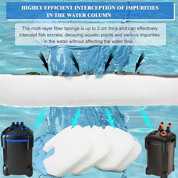 - Four-layer filtering 1. The White floss pads: trap most visible debris particles without restricting water flow and filter out fine particles providing crystal-clear water. 2. Activated Carbon Sponge Bio Filter Pads: Unlike other traditional biochemical sponge filter pads, these filter pads contain double-layer activated carbon, which can absorb impurities and odors in the water, reduce fishy odor and yellow water problems, and provide a safe and clean environment for fish. 3. The Removing Ammonia Pad absorbs the harmful ammonia. 4. Reducing Phosphate Pad absorbs excess Phosphate.