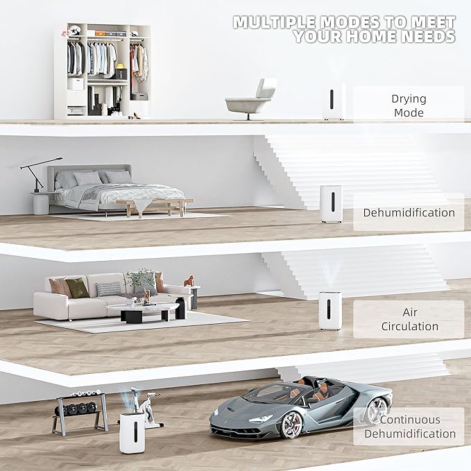 - 【Versatile Modes For Every Situation】- Enjoy flexibility with our home dehumidifier's 4 smart modes: DEHU, CONT, SDEHU And DRY. DEHU mode smartly adjusts humidity to your target level, SDEHU mode provides larger power to speed up dehumidification and CONT mode manages persistently moist areas, DRY mode quickly dries delicate clothes&cotton household items and prevents clothes from getting damp. Besides, You can choose between 2 fan speeds that fits your needs with ease, Please keep Doors and Windows closed when the dehumidifier is running.