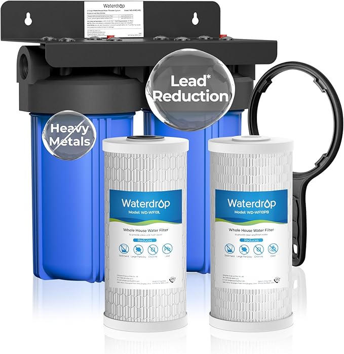 Waterdrop 2 Stage Whole House Water Filter System, with Carbon and Sediment Filter, Highly Reduce Lead, Chlorine, Heavy Metals, PFA, Taste, 5-Stage Filtration, WD-WHF21-PBL, 1" Inlet/Outlet