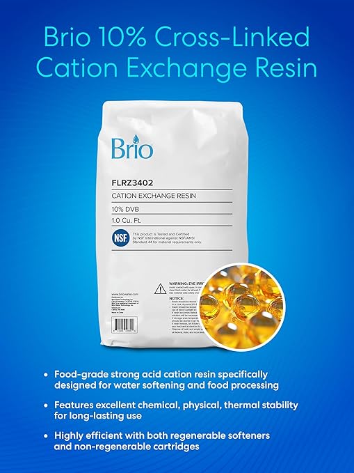 Brio Water Softner Resin Refill for Water Softener Systems & Cartridges | Cation Exchange Resin, 10% Cross-Linked DVB | NSF/ANSI Standard 44 Certified | 1 Cubic Ft. Bag