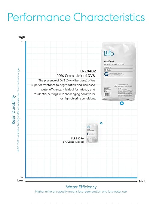- PREMIUM QUALITY: High-quality strong acid cation resin for comprehensive water softening; rigid polysytrene 10% cross-linked DVB resin construction offers superior resistance against chlorine oxidation that shortens resin lifespan, and a robust 48,000 grain capacity before regeneration is necessary