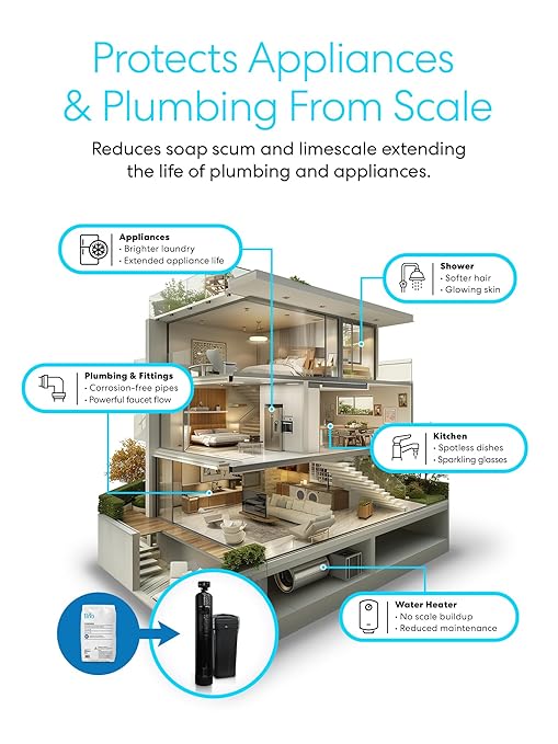 - PROTECTS APPLIANCES & PEOPLE: Thwarts destructive scale buildup on appliances and plumbing that can lead to expensive repairs and replacements; nourishes skin and hair with soft, spa-like water that reduces reilance on costly self-care products; makes laundry softer and brighter; and leaves dishes and glasses sparkling. Designed specifically for homes facing challenging hard water or high chlorine, iron or manganese conditions