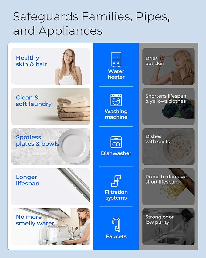 - [Protects Water Appliances] Protects your family, plumbing, and appliances by reducing water-related damage throughout the home. From healthier skin and softer laundry to spotless dishes and longer-lasting filtration systems, enjoy cleaner water and improved performance every day.