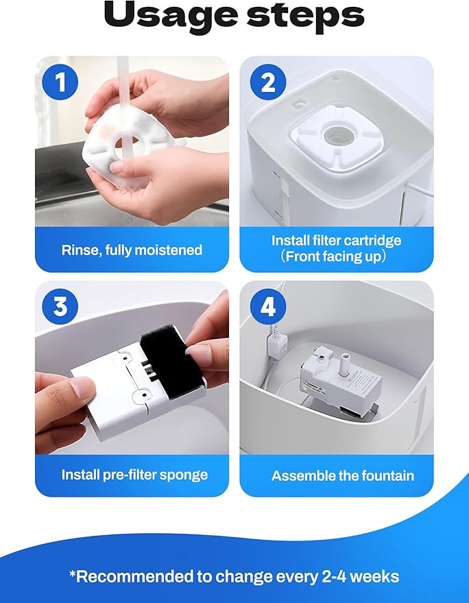 - π SIMPLE REGULAR REPLACEMENT: Maintain peak freshness by swapping the cat water filters and sponge every 2-4 weeks (depending on number of pets using the fountain). Just soak the new filter thoroughly into water for 5 minutes before placing it. Quick, easy, and ensures the best water quality.