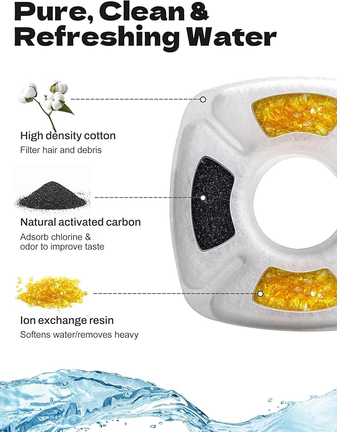 - π§ FRESH & CLEAN WATER FOR PETS: Advanced Triple Filtration in each cat water fountain filter replacement removes hair, sediment, heavy metals & odors using Activated Carbon, Ion Resin & Non-Woven Fabric. Provides appealing, clean water that encourages hydration and reduce urinary tract infections.