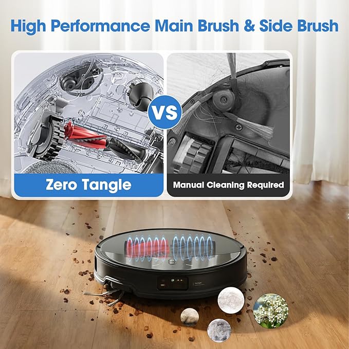 - Durable Brushes & Multi-Functional Mop Pads: Reinforced main brush and anti wrapping design side brushes effectively prevents hair from entering gap, and prevent scratches on the ground. Washable mop pads provide deep scrubbing for spotless floors—ideal for daily mopping and vacuuming cycles