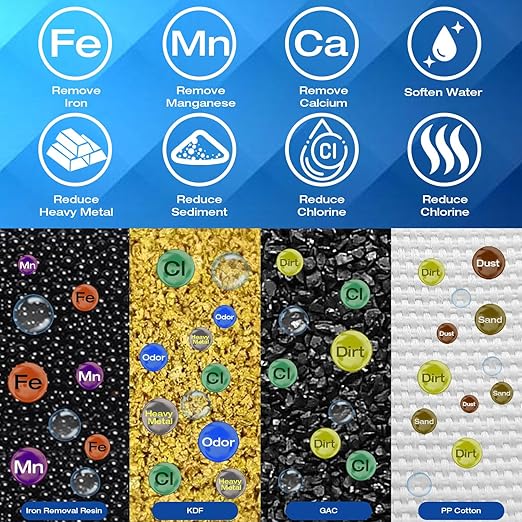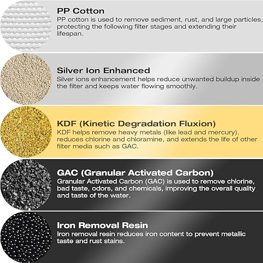 - Included Components Iron Water Filter, KDF Water Filter, PP Cotton : Purification Method Granular Activated Carbon, Ion Exchange
