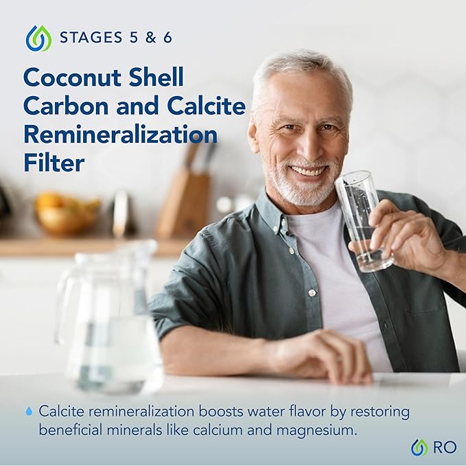 - Compact 6-stage reverse osmosis system with a 4-stage pre-filter/membrane and 2-stage post-filter in one cartridge Eco-friendly design cuts wastewater by 50% and uses fewer materials than typical 5-stage systems Lightweight, efficient packaging lowers environmental impact during shipping Easy maintenance—no tools or plumbing needed; swap cartridges in minutes Slim, space-saving design fits easily under most sinks Post-filter adds beneficial minerals like calcium and magnesium for great taste and hydration