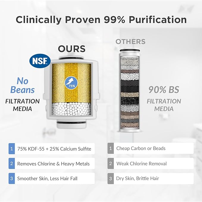- 【NSF-177 Certified – Dermatologist-Approved Filtration】This advanced shower filter uses NSF-177 certified premium 75% KDF-55 media—three times more effective at removing heavy metals than standard filters—to eliminate up to 99% of chlorine, lead, mercury, and odors. Combined with 25% calcium sulfite, it reduces hair thinning, soothes dry/itchy skin, and protects against hard water damage. Clinically proven to deliver visibly softer skin and shinier hair within 14 days—for a gentler, healthier shower experience.