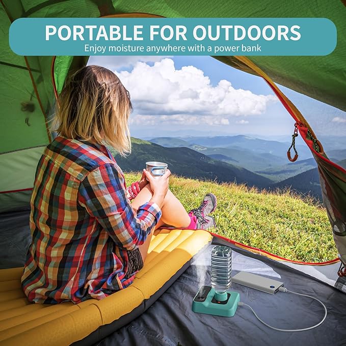 - ✅ LIGHTWEIGHT, SMALL & PORTABLE - With only 7 ounces light-weight and 5.91 inch wallet size body, this portable humidifier is super easy for you to carry with during camping, travel or business trip; just simply add a bottle of water and you can start enjoy the mist of humidity wherever it is.