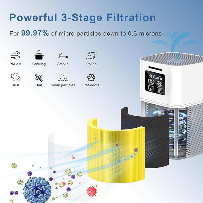 - 3 Stage Filtration: The premium A1 filter adopts 3stage true HEPA filtration technology, which includes a Nylon Pre-Filter, H13 True HEPA Filter, and Activated Carbon Filter. This ensures it effectively clean up nearly all kinds of airborne particles as small as 0.3 microns, as well as unwanted odors, including pet dander, dust, PM2.5, pollen, smoke, tiny particles, and VOCs. It provides your family with clean and fresh air, promoting a healthier living environment.
