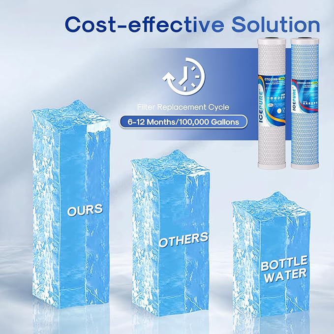 - High Efficiency Deep Filtering - The ICEPURE CTO activated carbon filter have a stronger adsorption capacity than ordinary filters and can effectively remove residual chlorine, discoloration and odor from water. Meanwhile, the micro-porous structure of the carbon block filter can effectively intercept large particle impurities, retain beneficial minerals, make the effluent clear and have a more natural taste, making it suitable for direct drinking and cooking.