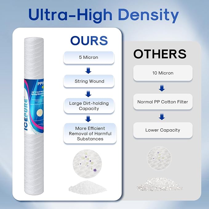 - High Quality - ICEPURE water purifiers adopt American technology and teams. The whole house string wound sediment water filter for well water is made of food-grade materials, lead-free and BPA-free. Every filter of the ICEPURE brand undergoes multiple inspection and testing stages before leaving the factory to ensure that each product meets our high expectations.