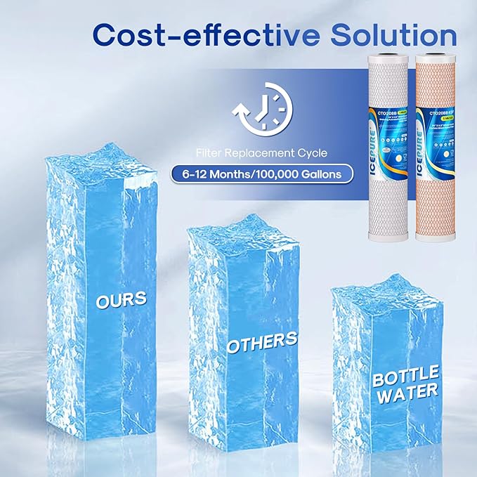 - High Efficiency Filtration - The ICEPURE CTO20BB whole house water filter has passed the certification of the international standard NSF/ANSI 42, with a filtration accuracy of 1 micron. It can effectively reduce chlorine, odor and taste in water, effectively improve water quality, reduce scale, and provide you and your family with a wonderful drinking experience.