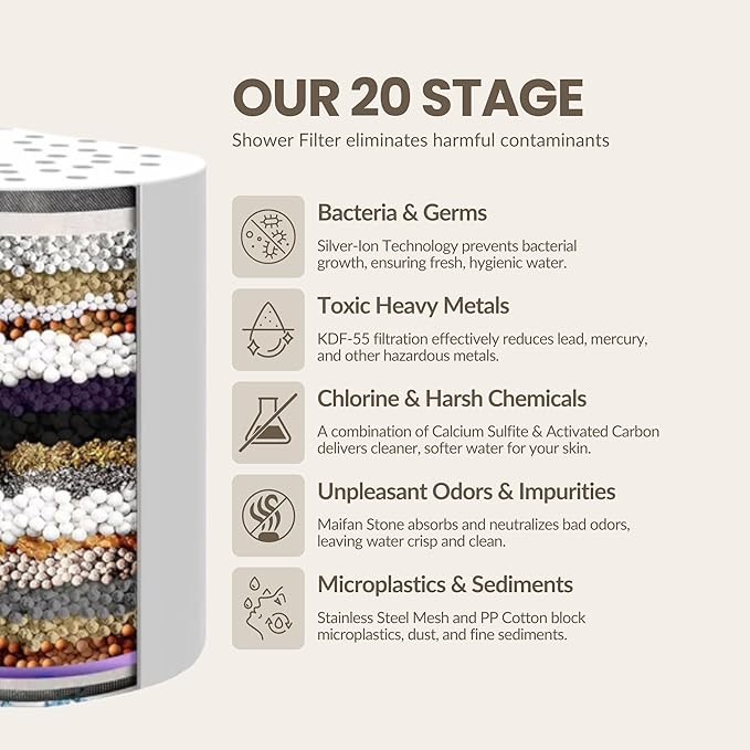 - πππ©ππ‘πππ ππππ§π₯ππ§ππ’π‘ ππ’π₯ πππππ‘ππ₯ π¦ππ’πͺππ₯π¦: Experience the power of Halo Filters' 20 stage shower head filter, engineered to remove up to 99% of chlorine, heavy metals, and other harmful impurities. This high-performance water softener shower head ensures a cleaner, safer, and more refreshing shower, perfect for homes with hard water.