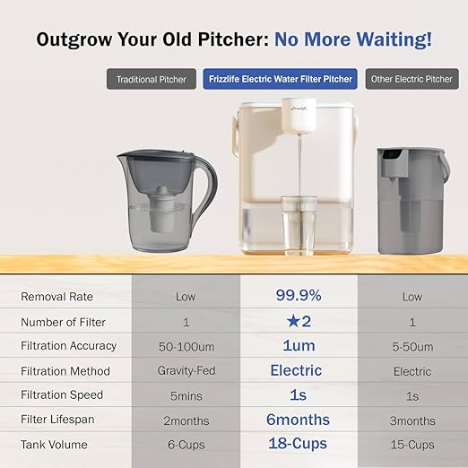 - 【1-Micron Dual-Filter Tech - Removes 99.9% of Contaminants | Keeps Healthy Minerals】-- Frizzlife MD40 innovative water dispenser features two pre-installed 1-micron filters that work together to remove 99.9% of contaminants including chlorine, lead, fluoride and PFAS, PFOA/PFOS while preserving essential minerals for better-tasting water. Unlike standard single-filter pitchers, our Dual-Filter technology provides superior purification - the perfect balance of clean water with minerals intact. The BPA-free design ensures complete safety for your family.