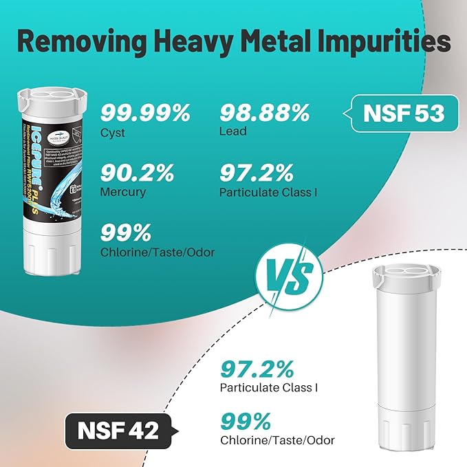 - Authoritative Certification - The ICEPURE PLUS RWF5200B refrigerator water filter has undergone international authoritative certifications, including triple certifications of NSF/ASIN 53, NSF/ASIN 42 and NSF/ANSI/CAN 372, and complies with the European food grade regulation EC-1935/2016, ROHS, REACH, BPA-free, TUV and the Australian Water Mark.