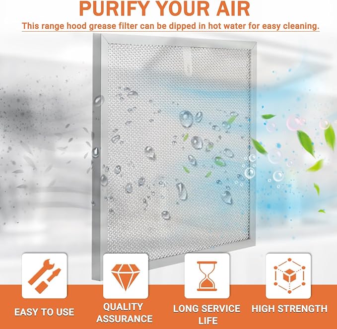 - Cleaning tip: Soak in hot water and degreaser for 10-20 minutes, gently stir to remove loose grease.To maintain the performance of the range hood, maintain air circulation and eliminate odors, it is recommended to replace the filter every 3-6 months