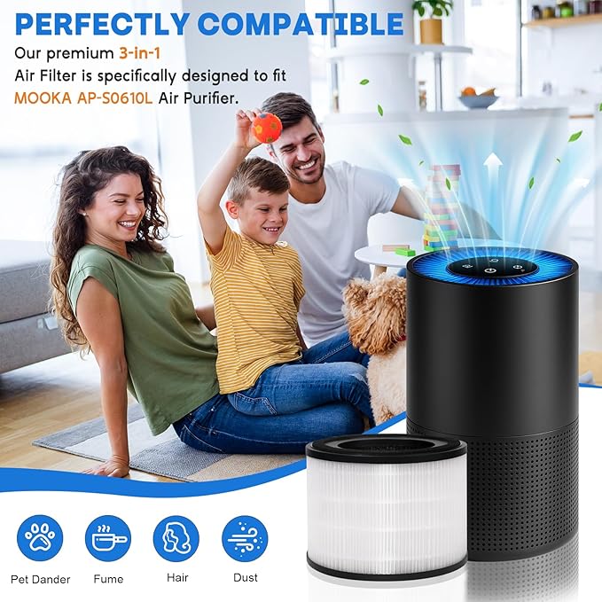 AP-S0610L Air Filter Replacement Compatible with Mooka, 3-in-1 H13 Ap-s0610l Replacement Filter, Pre-Filter Activated Carbon Fit for Mooka Air Puri-fier, 2 PC, White