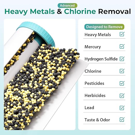 - Whole Home Heavy Metal Filtration: This whole house water filter system provides powerful two-stage protection for your home. Stage 1 uses high-performance KDF and granular activated carbon (GAC) to reduce chlorine, chloramine, lead, mercury, hydrogen sulfide (H₂S), radon, pesticides, herbicides, industrial chemicals, and other heavy metals. It also removes dirt, rust, sand, and particles as small as 5 microns—perfect for both city water and well water filter system needs.