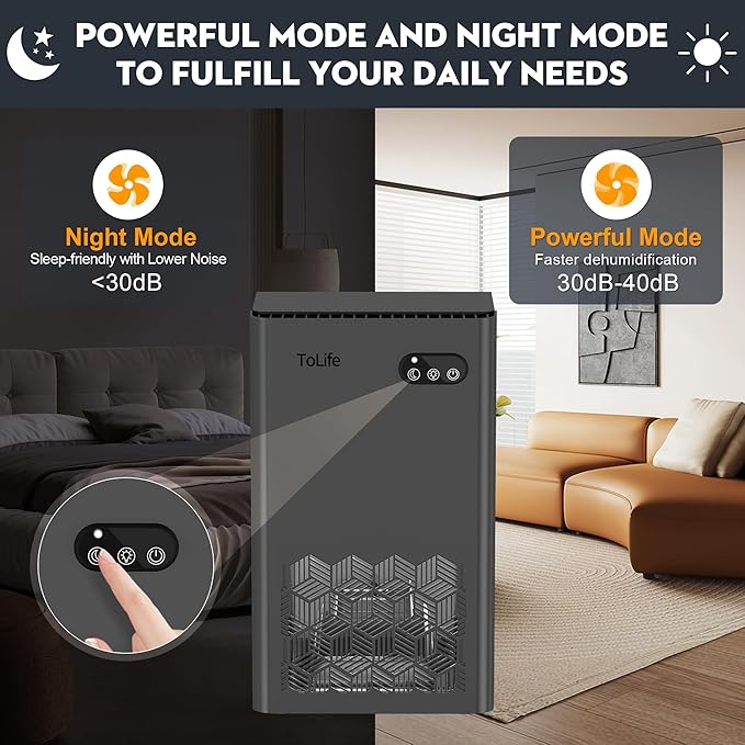 - TWO DEHUMIDIFIER MODES: The dehumidifiers for home offers a powerful mode that efficiently reduces humidity, allowing for quick and effective moisture elimination. It also features a low-speed sleep mode for quiet operation (< 30 dB) while you sleep