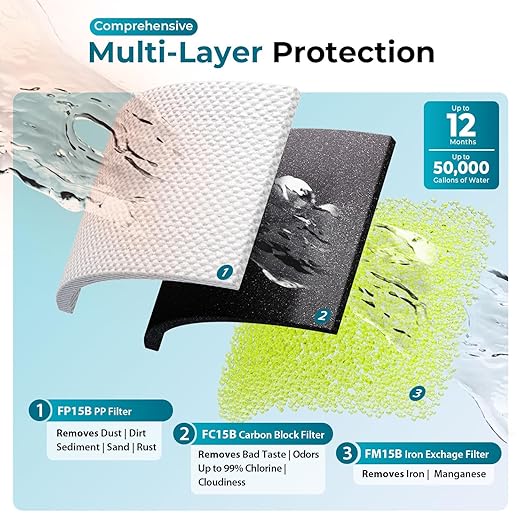 - Long-Lasting Performance — Built for durability and steady flow, this whole house water filter treats up to 50,000 gallons or 12 months, providing families with reliable, long-term filtration.