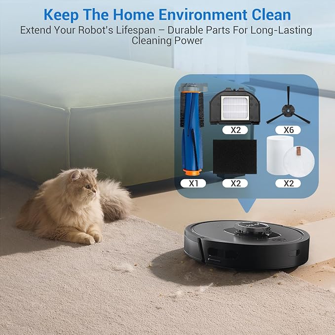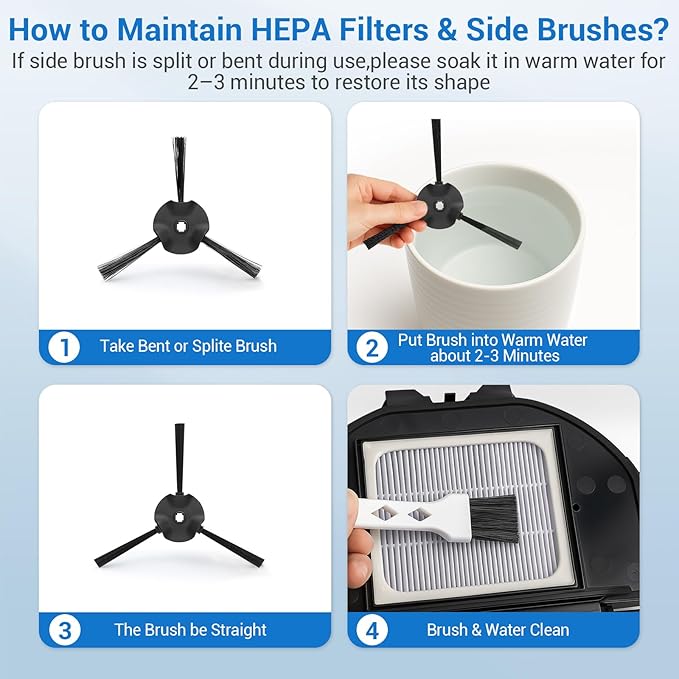 - 【Replace & Using Advice】It is recommended to replace the side brush and filter every 2 - 3 months, and the multi-surface brushes every 6 months, or according to your frequency of use for best results. (The side brushes may bend during transportation, please soak the side brushes in hot water. Soak the side brushes in hot water for a few minutes to restore them to their original shape). Easy to install, ready to replace, make replacement parts compatible with your machine ready at any time!