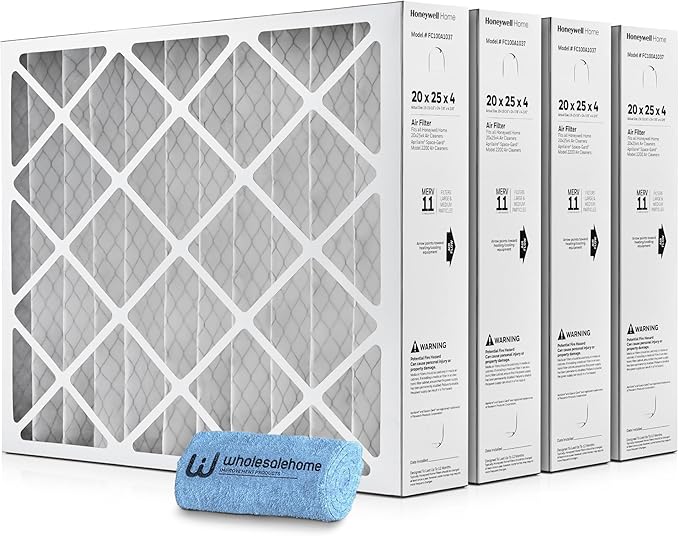Honeywell 20x25x4 Air Filter Replacement MERV 11, FC100A1037 Pleated HVAC AC Furnace Filters with Wholesalehome Cleaning Cloth, 4-Pack (Actual Size: 19.94 x 24.88 x 4.38 Inches)
