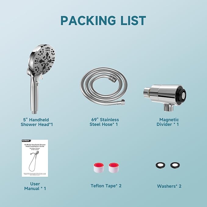 - 【Package Contents】5" Handheld Shower Head*1,69" Stainless Steel Hose* 1,Magnetic Divider * 1,Teflon Tape* 2,Washers* 2,User Manual * 1. NO shower arm included in the packaging.