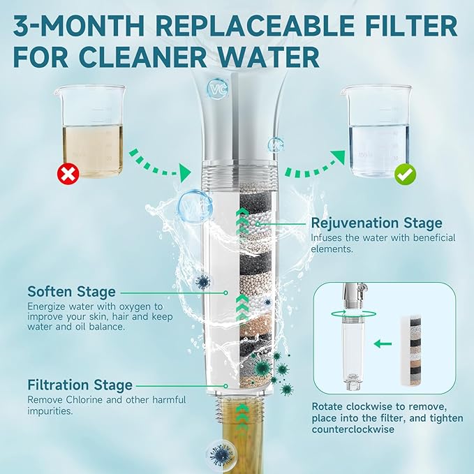 - 【Built-In Water Filtration for Healthier Skin & Hair】 This water softener shower head features a replaceable filter (included) that reduces chlorine, heavy metals, and impurities—delivering softer water in every shower. The filtered shower head ensures a gentler cleanse for sensitive skin and hair.