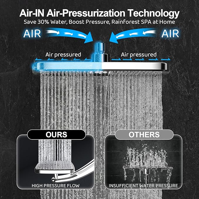 - 12 Inch Rainfall Square Head & Self-Cleaning Nozzles Immerse in pure luxury! The large 12 inch square rain shower head delivers a full-body rainfall sensation. Enjoy complete coverage and relaxing rain shower head showers with easy-clean nozzles that resist clogging.