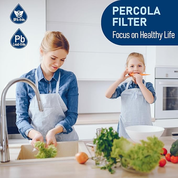 - Triple Stage Filtration: Featured with 5 micron small pore size, PERCOLA filters are equipped with Triple Action Filtration. First stage non-woven media captures the larger particles, then in the second stage, the pleated sub-microns membrane reduces particles as small as 5 microns, and finally, the carbon block reduces chlorine taste, and odor and select VOCs.